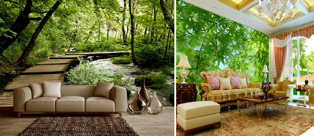 Настенное покрытие с 3d эффектом сделают незабываемым интерьер абсолютно любой комнаты. Так, в гостиной вы можете создать уютное летнее кафе, в детской — любимую сценку из волшебной сказки, в спальной комнате — бесконечные поля с прекрасными цветами. В ванной комнате можно изобразить берег тихой и задумчивой реки.