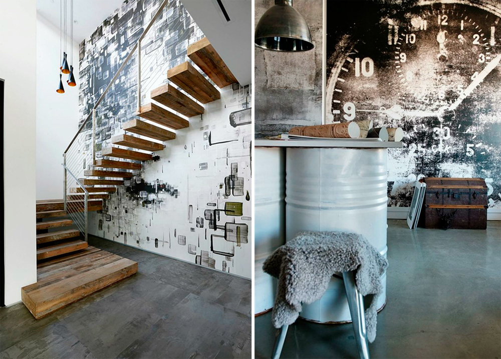 Узоры, мотивы могут быть не откровенно промышленными. Лофт – это не только бетон, кирпич. Любителям оригинальных идей понравятся объемные обои для стен с геометрическими узорами, сюжетами в стиле ретро.