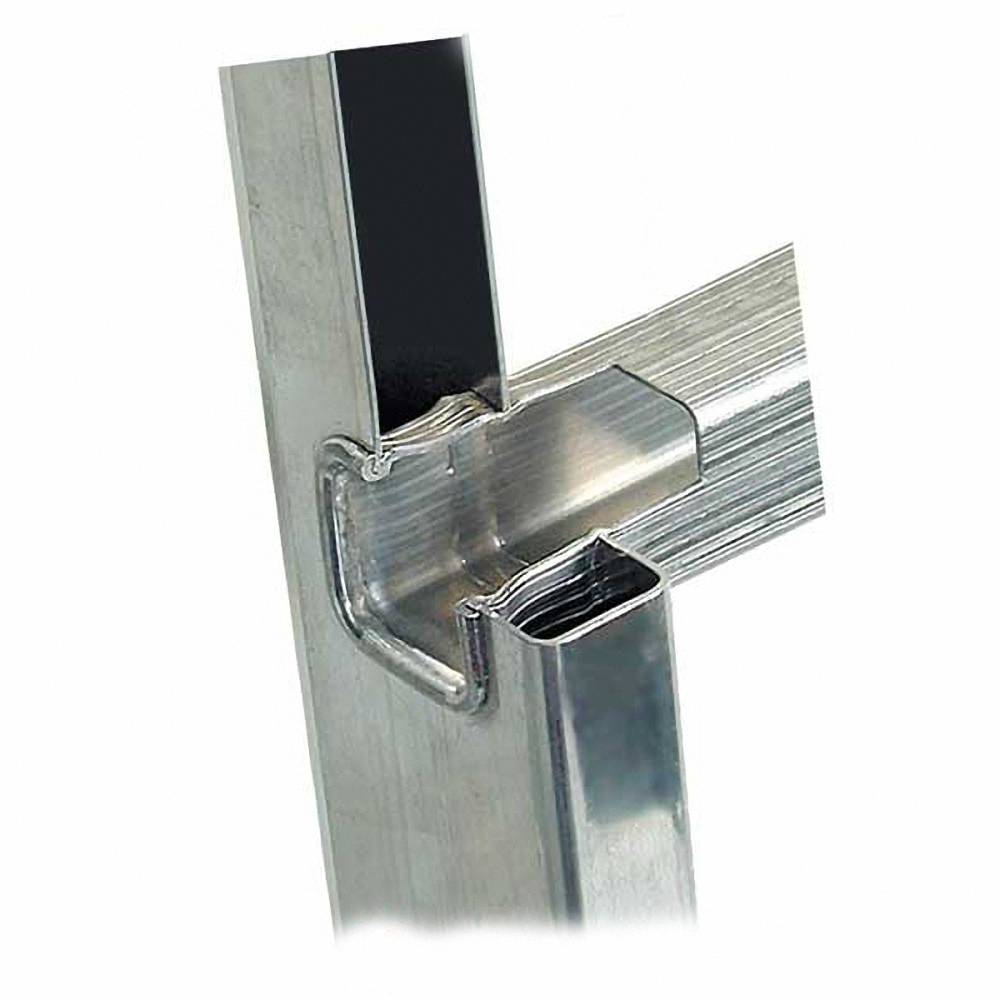 - Крепления, обеспечивающие безопасность конструкции. Лестницы алюминиевые раздвижные должны быть обязательно оснащены ограничителями и фиксаторами, которые жестко фиксируют секции в разложенном виде и предохраняют от самопроизвольного складывания.