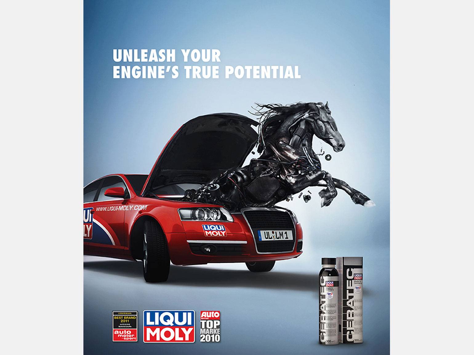 Несмотря на то что на рекламном плакате Liqui Moly капот и лошадь находятся примерно в одной плоскости, автомобиль кажется ближеИзображение: Liqui Moly / Jirka Väätäinen / Behance