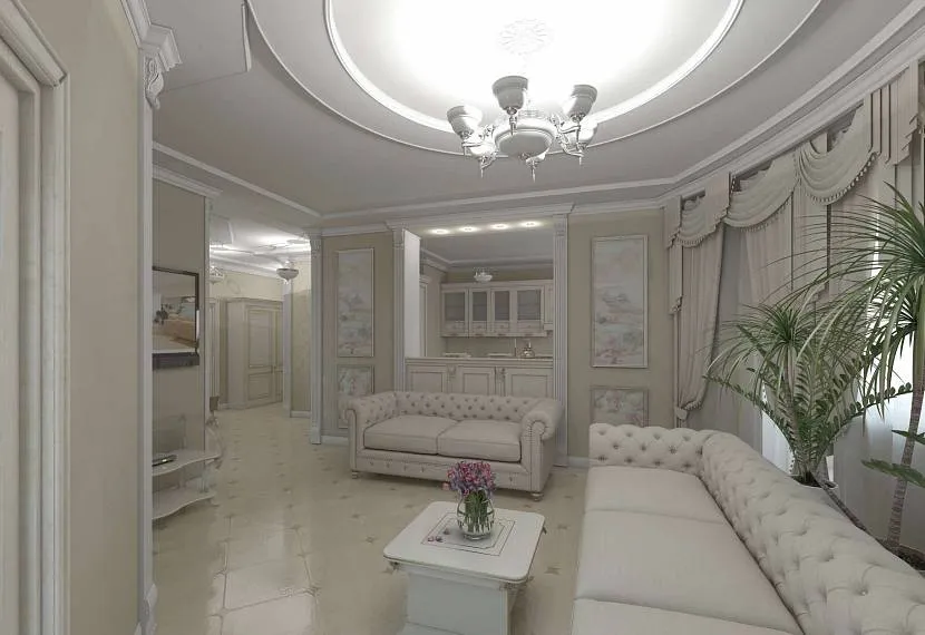 На полу в гостиной постелена плитка белого цвета. Такого же оттенка и стены, но вот потолок двухъярусный – красивого фиолетового цвета и встроенным освещением.