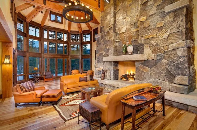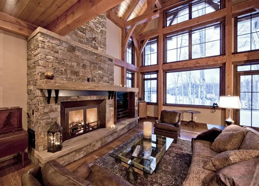 Стены зашиты деревом, чаще всего панелями из бруса. Зона вокруг камина декорирована природным камнем с минимальной обработкой.