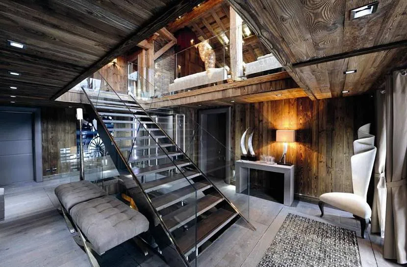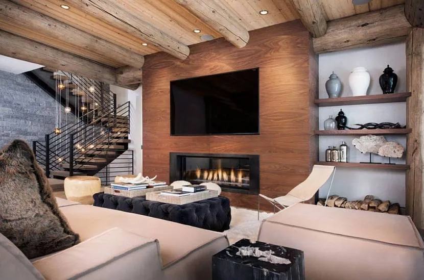 На фоне искусственно состаренных деревянных и каменных поверхностей смотрится необычно. Подобные дизайнерские решения могут быть применены в любой комнате. Наиболее характерны они для гостиной шале.