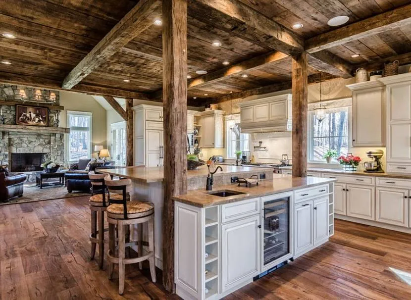 Потолочные навесные конструкции обнажены. Деревянные круглые или квадратные балки, в виде колонн подпирающие потолок, хорошо смотрятся в очень просторных помещениях.