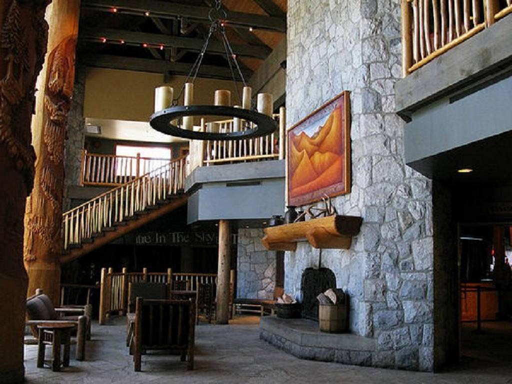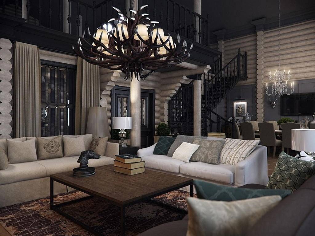 Сглаживают брутальность стиля композиции из сухоцветов или живые местные цветы в стеклянной вазе. Центральная люстра зачастую привлекает массивностью, простотой формы, и в то же время величием. Обычно она сделана из металла и имитирует подсвечники. Нередко люстры украшаются оленьими рогами.