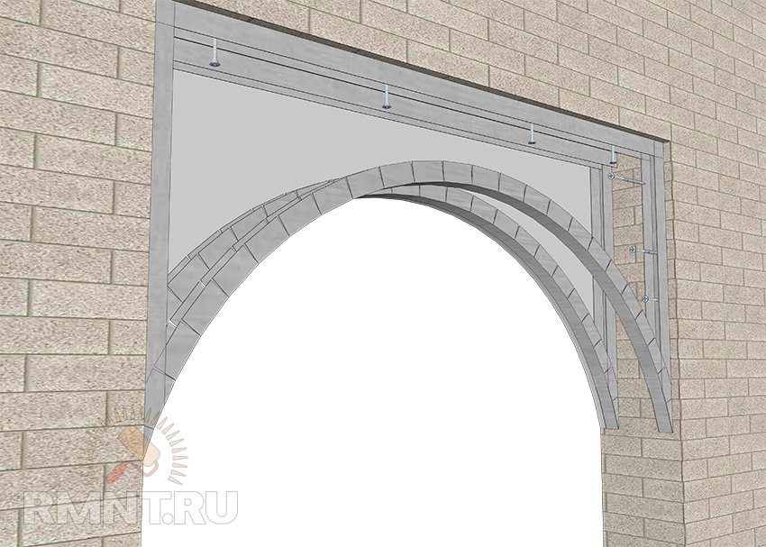 Отрежьте два куска профиля длиной с ширину проёма и прикрепите их сверху, и по паре профилей установите с обоих боков. Длина боковых направляющих зависит от величины радиуса арки.