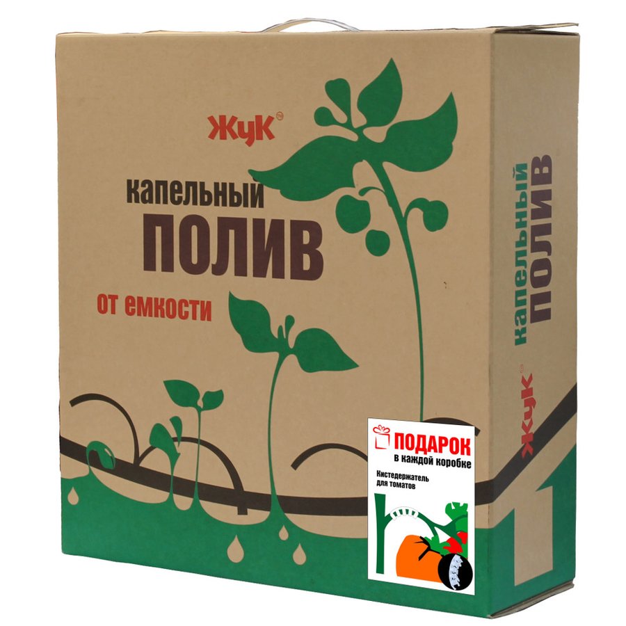 Капелька подходит для орошения на открытом грунте. Шланга с капельницами хватает на 4 грядки длиной до 10 метров каждая. Доступность товара объясняется отсутствием автоматизма этой системы. Полив осуществляется из емкости, которую возможно приподнять на 1,5 метра.
