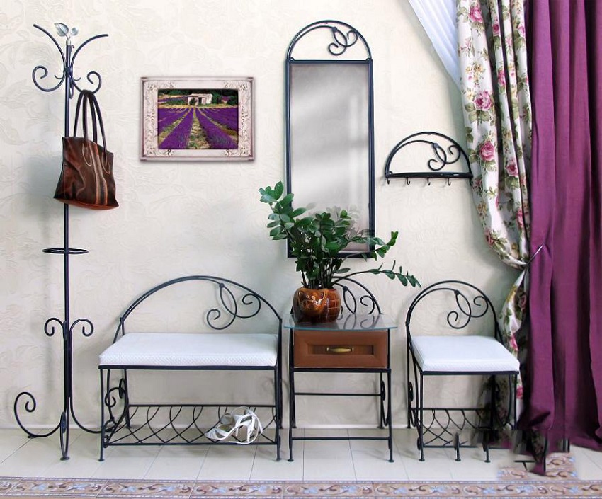 Самые долговечные модели – кованые банкетки в прихожую, которые подходят для интерьеров «классика», «прованс», «ампир».