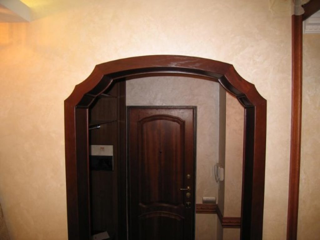 Проще всего из кухни в коридор сделать арку – портал. При этом сохраняется прямоугольная форма, только обычные наличники заменяются рельефными и верхний должен быть шире и массивнее, чем боковые. По сути, портальная арка, это обычный дверной проем, только красиво отделанный и с акцентом на верхушку.