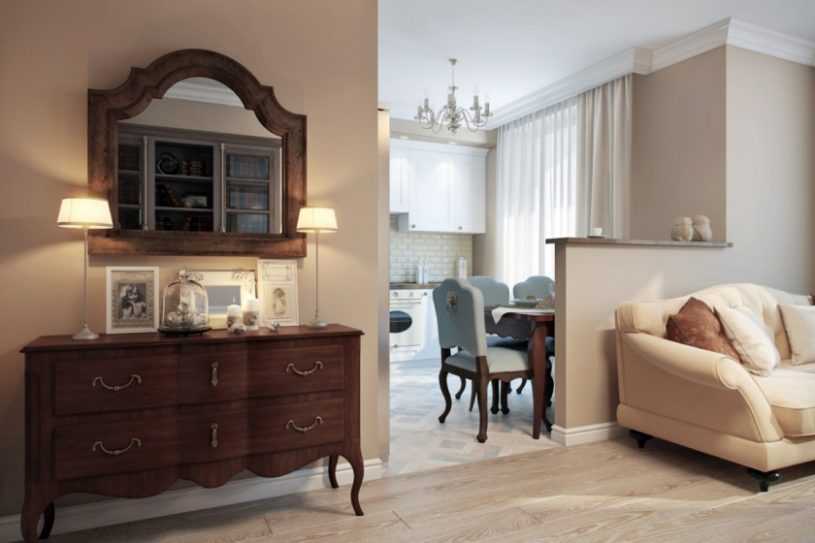 Данное направление в дизайне интерьере объединяет в себе уют и функциональность. На стыке кухни и гостиной можно разместить широкую барную стойку из натурального дерева. Таким образом, получится не только разделить пространство, но и создать дополнительное место для приготовления и принятия пищи.