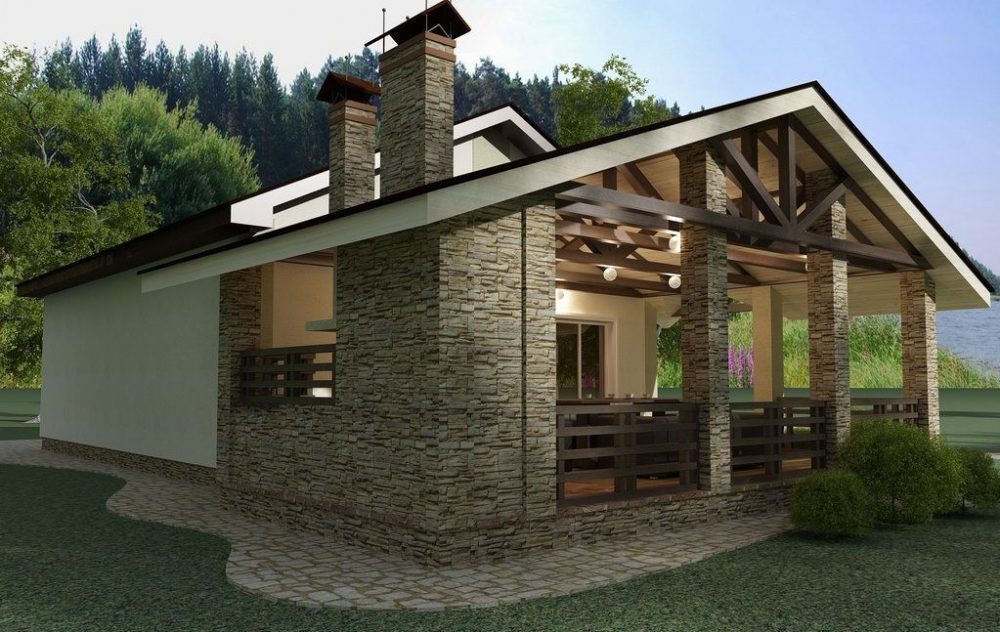 Проекты бань с большой верандой могут предусматривать и одноэтажную застройку. А почему бы и нет, если участок позволяет? Да и потом, баня вполне может обойтись и без спален, а небольшой комнаты отдыха хозяевам вполне может быть достаточно.