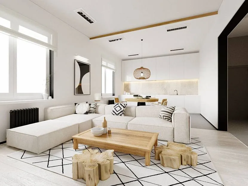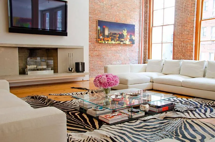 Возле мягкой мебели можно разместить коврик с приятной текстурой, например, с длинным ворсом. Отличным вариантом будет выбор расцветки под зебру. Такое сочетание подойдет монохромному интерьеру, поскольку оно выглядит сдержанно и элегантно.