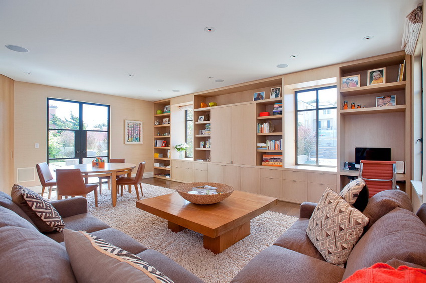 Планировка помещения. Гостиная может быть квадратной или прямоугольной формы. Также современные планировки предполагают совмещение ее с кухней или столовой. В зависимости от этого модули будут либо выстраиваться в линию, либо заполнять угол, либо осуществлять зонирование.