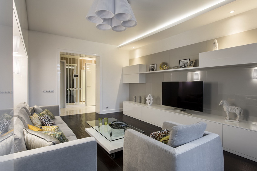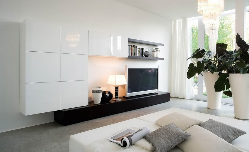 В современном дизайне мебели отводится чистая функция, которой подчинены и форма, и цвет. Здесь гарнитур чаще всего сливается с отделкой стен, визуально освобождая пространство. Но это необязательно матовая мебель: стенка для гостиной «белый глянец» будет отражать свет, тем самым зрительно расширяя помещение
