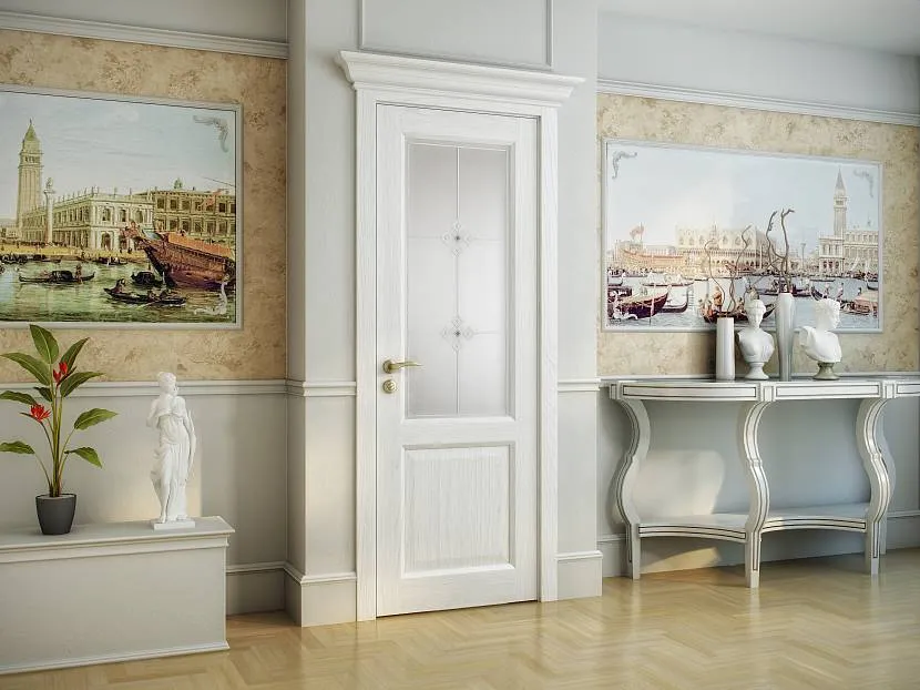 Дорогие модели выполняются из массива беленого дуба и белого ясеня. Дуб в интерьере – лучший выбор для классического стиля, которому добавляет добротности. Изысканностью и прочностью отличаются двери из белого ясеня. Древесина с красивой яркой текстурой достойно выглядит в самом респектабельном доме или офисе. Она создает в помещении ауру свежести и чистоты. Особенно хорошо смотрится белая дверь с такими же окнами и плинтусами.