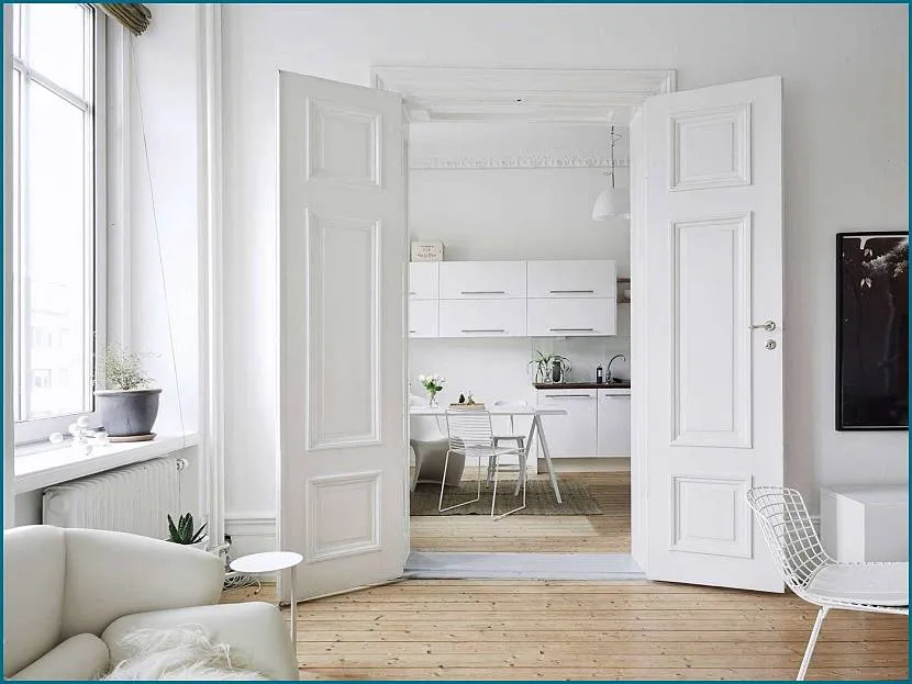- Воздушность. Большая часть современного жилья не может похвастаться обширной площадью. В условиях тесного пространства белый цвет является самым выигрышным. Он не будет утяжелять комнату, более того, придаст ей легкость и воздушность. Простота такой двери, возможно, не приковывает к себе внимания, но зато и не отвлекает его от главных элементов в интерьере. Наиболее выгодно сочетать в маленьких комнатах белые двери со стенами нейтральных тонов. В таком случае создается иллюзия целостного пространства, когда стена кажется непрерывной, а комната – более вытянутой. Также двери молочного цвета идеальны для комнат с низкими потолками, они помогут вытягивать пространство вверх.