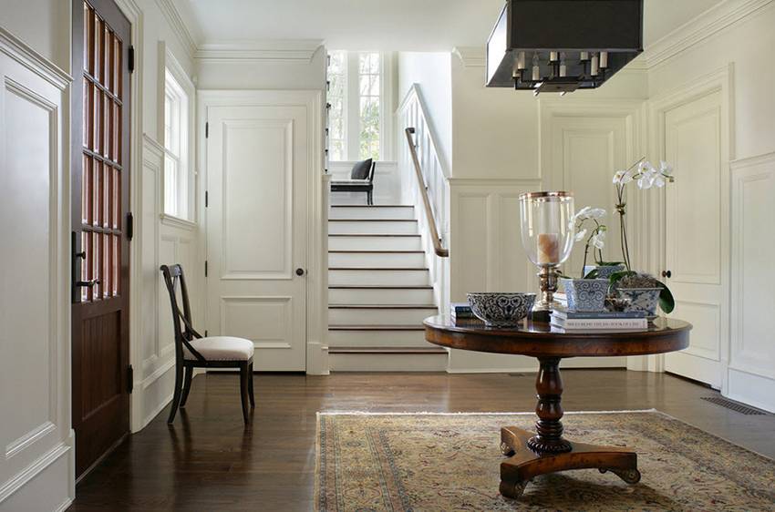 Еще один популярный ход –белые двери в классической прихожей. При чем сами они могут быть вообще без декора, решающим фактором в этом случае становится светлый цвет. И иногда – интересная модель ручки.