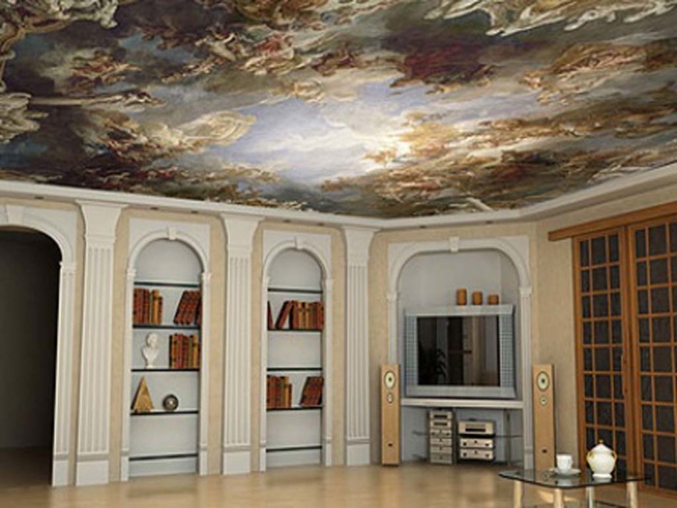 - Материал тканевого полотна для отделки потолка можно окрашивать, наносить на него фотопечать, тем самым меняя внешний вид комнаты. Большой популярностью пользуются объемные рисунки, которые на потолке выглядят просто невероятно.
