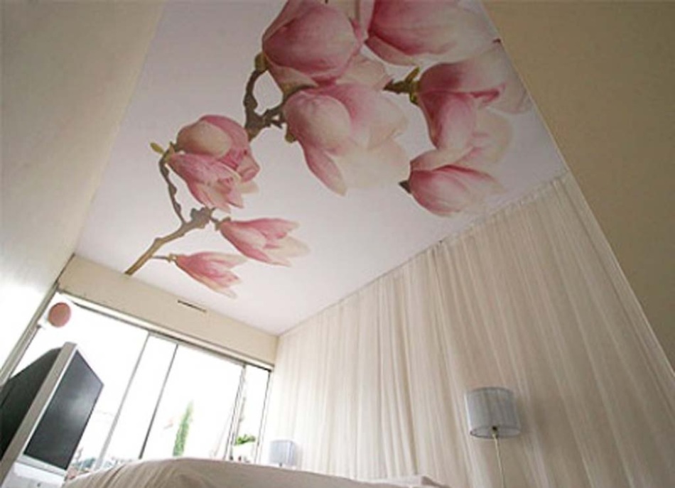Романтичные цветы, нежные плывущие облака или настоящее ночное небо с грамотно встроенными светильниками – все это можно реализовать с помощью натяжных потолков с фотопечатью. Только не бери слишком яркие, броские и кричащие рисунки – все-таки тебе тут отдыхать.