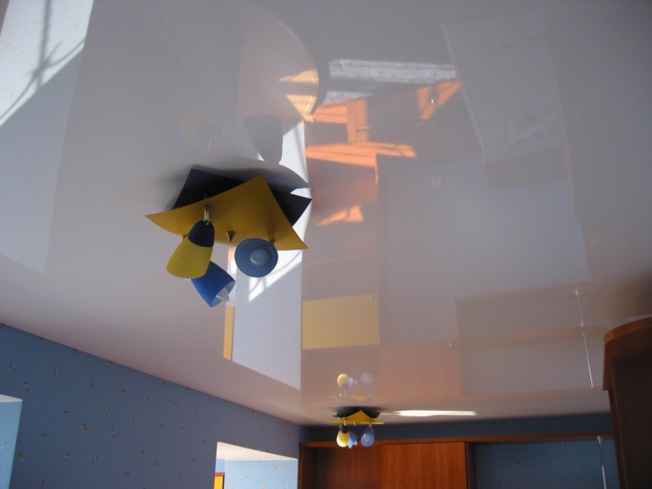 Хотя глянцевые полотна и имеют меньше преимуществ, чем матовые, но все же, являются более популярными за счет своей необычной структуры. Если выбирать белый глянцевый потолок, то все предметы, которые находятся в помещении, будут отображаться на полотне, за счет чего потолок будет казаться не только выше, но и шире.