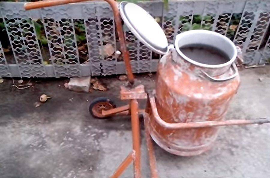 В домашних условиях можно за пять минут сделать своими руками бетономешалку из молочной фляги (бидона) и кусков металлических труб. Достоинство такого способа в том, что емкость уже оснащена плотной крышкой, а значит, продумывать этот элемент конструкции не потребуется.