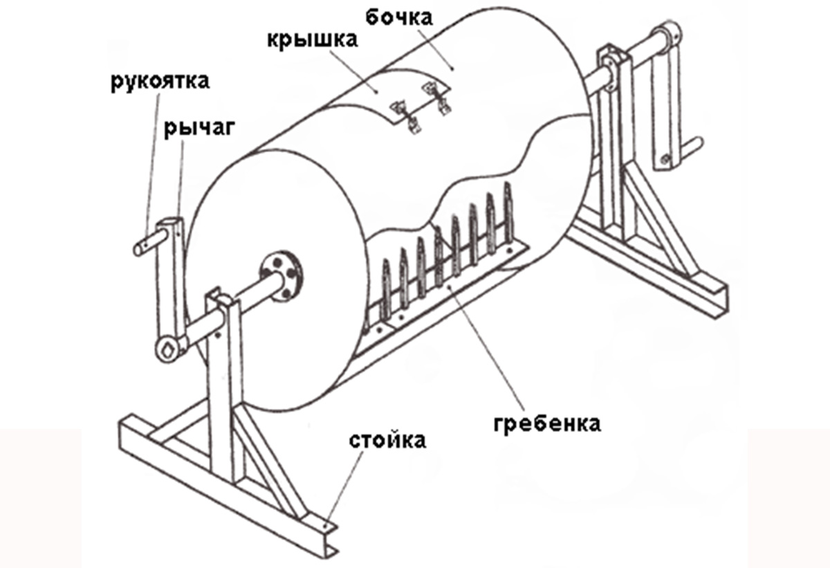 По наружной поверхности бочки монтируют кольцо в виде металлической ленты, которую приводит в движение мотор. Своеобразный поясок позволяет ёмкости вращаться вокруг своей оси. Устанавливают бочку на каркас, используя для крепления сварку.