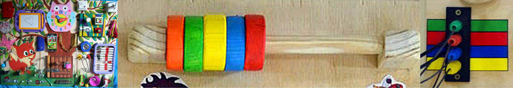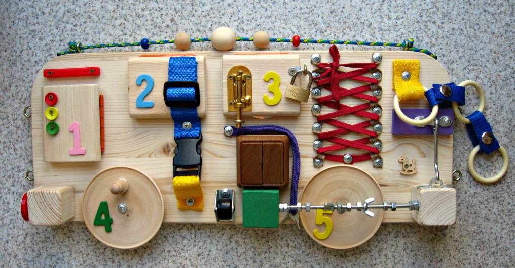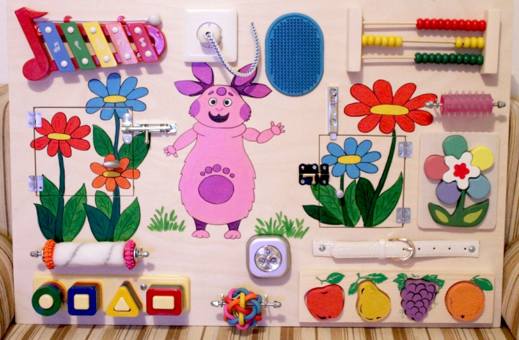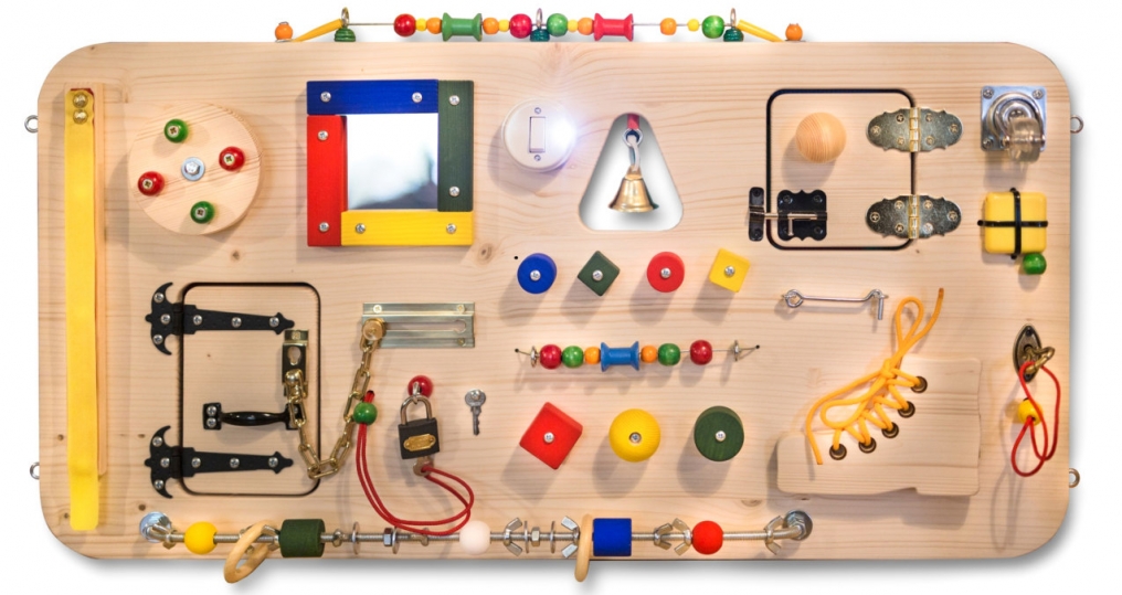С целью обучения доска дополняется фигурками с базовыми цветами, различными формами, картинками с животными. Оптимально укомплектовать бизиборд игрушками типа лабиринта, их можно купить готовыми или изготовить собственными руками.
