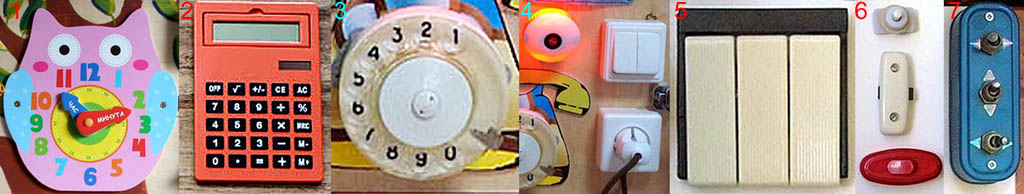 Для перехода от интуитивно ощутимого количества к его численному (цифровому) выражению современность предлагает мощное средство – действующий калькулятор, поз. 2. На бизиборде его можно запитать от общего источника (см. ниже). Калькулятор, в свою очередь, станет звеном для перехода к действиям уже на основе обобщения, см. далее, т.к. области его клавиатуры функционально различны. Поэтому для бизиборда лучше найти детский калькулятор с цветовым выделением клавиатурных областей. Правда, на продажу такие предлагают что-то мало и плохо.