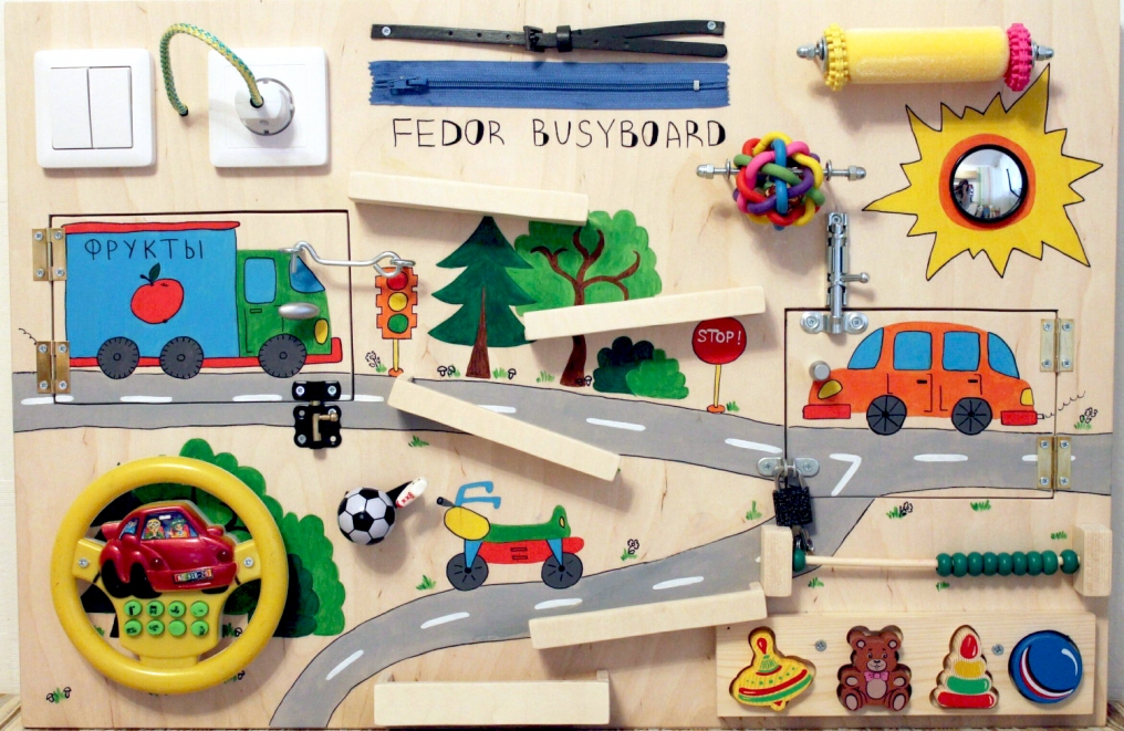 Бизиборд – это умная игровая доска, на которой расположены различные элементы, не представляющие опасности для ребенка. Все детали на доске можно трогать, гладить, при этом некоторые из них имеют особые способности – они щелкают, двигаются, светятся, открываются и закрываются, издают звуки.