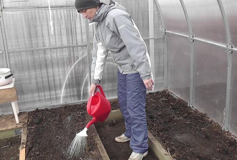 Весной, как только грунт в теплице оттает, подготовку продолжить. Почву вновь перекопать, внести при этом на единицу площади по стакану золы, 2 ст. л фосфорного удобрения (суперфосфат), 1 ст. л калийного (сульфат калия). За 10-14 дней до посадки почву полить раствором «Фитоспорин -М».
