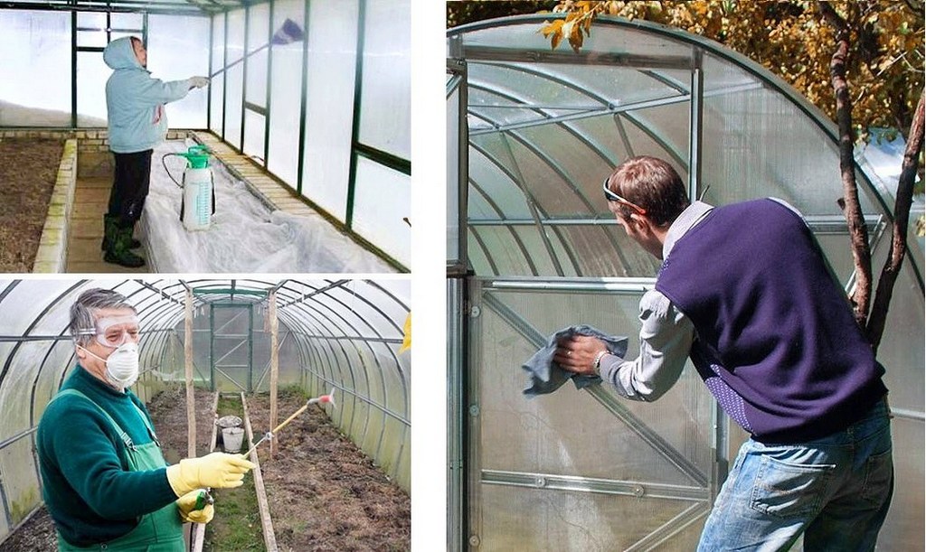Для очистки стекол и панелей из поликарбоната используют химические средства, в составе которых есть хлор. Для работы одевают специальную одежду. Весь инвентарь и тару удаляют из теплицы, а перед входом расстилают коврик, пропитанный аммиачной селитрой, медным купоросом или хлорированной известью.