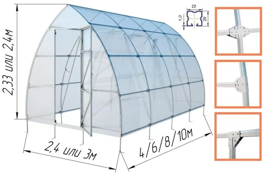 Максимальная снеговая нагрузка ограничивается 295 кг/кв. м. Конструкция имеет две двери и две форточки. Допускается установка автоматической системы открывания форточек или устройства капельного полива.