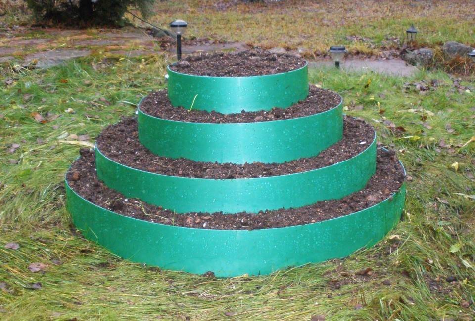 - Начать нужно с верхнего элемента. Для этого возьмите самую широкую ленту. Сделайте из неё высокий ярус – вкопайте ограждение, а сверху насыпьте землю.