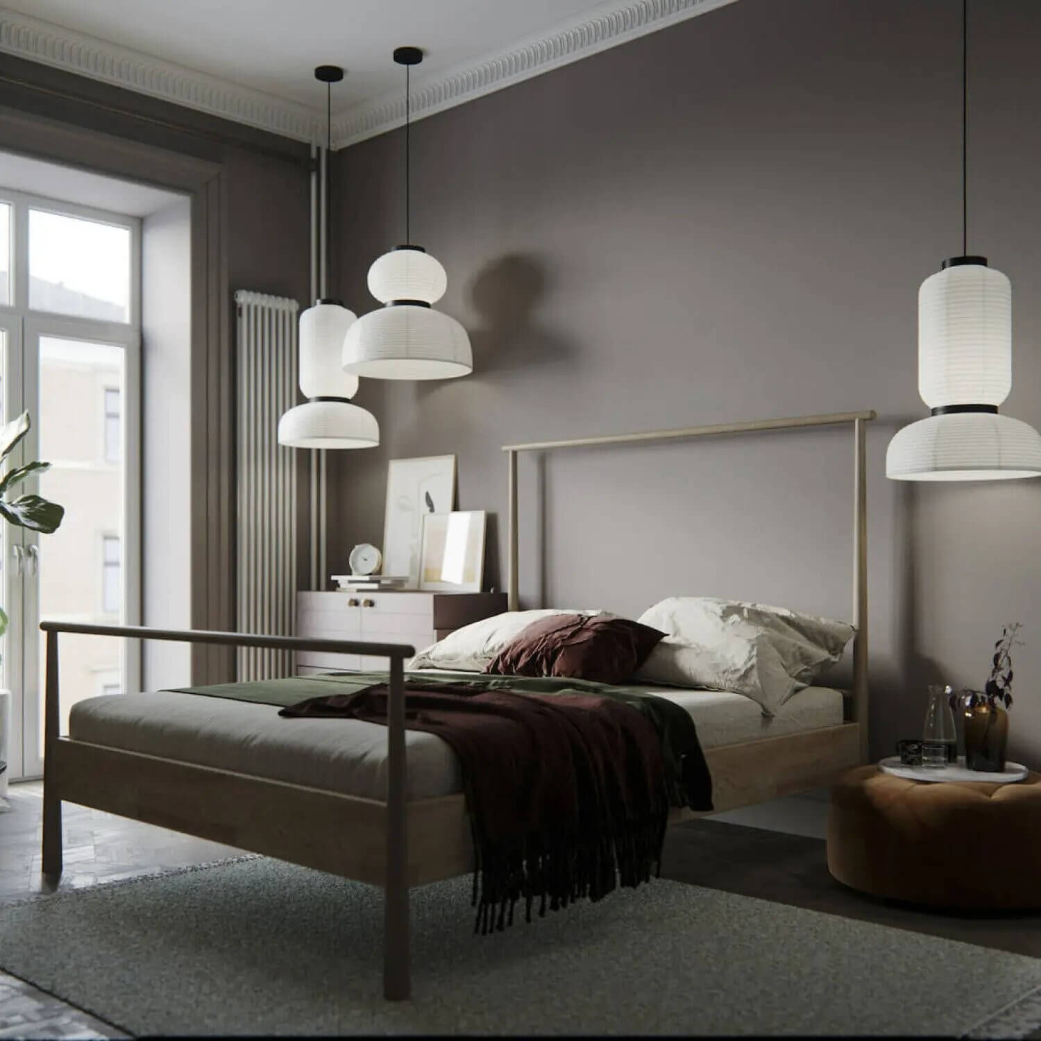 В комнате поставили кровать с удобным ортопедическим матрасом, невысокое изголовье которой обито приятной тканью в бежевой гамме. Рядом разместили стёганую банкетку со светлой обивкой и круглый кофейный столик из древесины. Напротив окна установили платяной шкаф, изготовленный из массива сосны и бука. Дизайнеры декорировали дверцы по периметру эффектным белоснежным кантом.