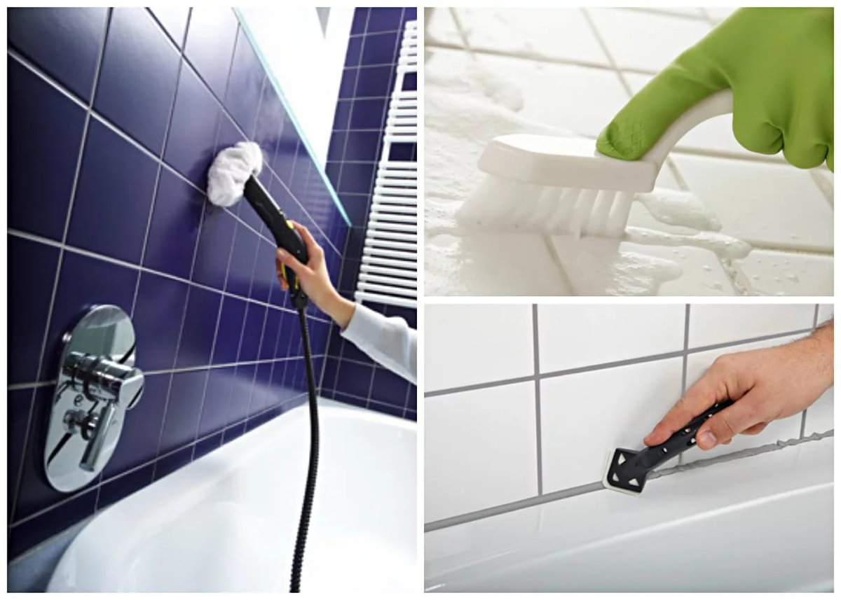 Плесень можно удалить несколькими способами. Первый и, пожалуй, самый эффективный — использование пароочистителя. Это устройство выпускает горячую струю пара под высоким давлением. Чистка паром фактически “сварит” всю плесень в швах и на поверхности кафеля, после черные пятна будет легко собрать тряпкой.