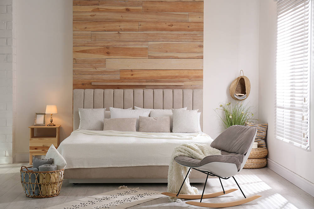 - Ламинат. Недорогой и универсальный. Можно использовать в спальне в зоне изголовья кровати. В гостиной будет отличным вариантом для покрытия перегородок.