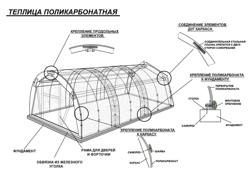 Существует два способа точно и качественно собрать тепличный каркас. Первый случай предполагает составление самостоятельно или использование готовой инструкции по сборке теплицы из поликарбоната своими руками. Это наиболее простой вариант, доступный даже для самых далеких от строительства людей. Хорошим вариантом считается составление плана сборки теплицы из поликарбоната своими руками по