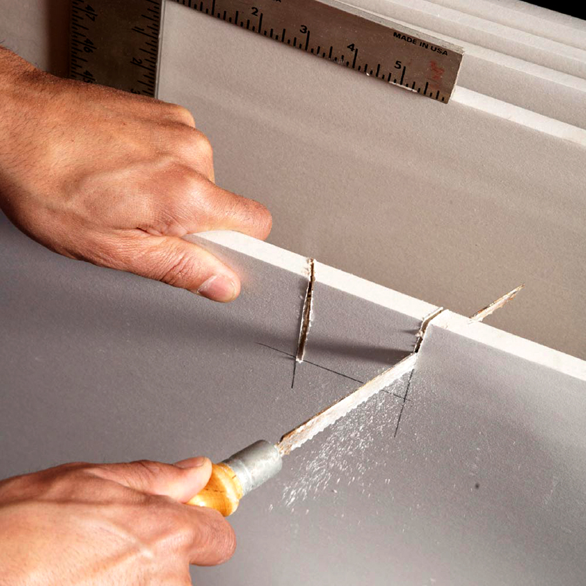 Стекломагнезитовый лист СМЛ очень прост в обработке. Начальная кромка плиты легко прорезывается обычным строительным ножом, после чего лист нужно согнуть в противоположную сторону в месте сделанного разреза. Затем изгиб аналогично разрезается.