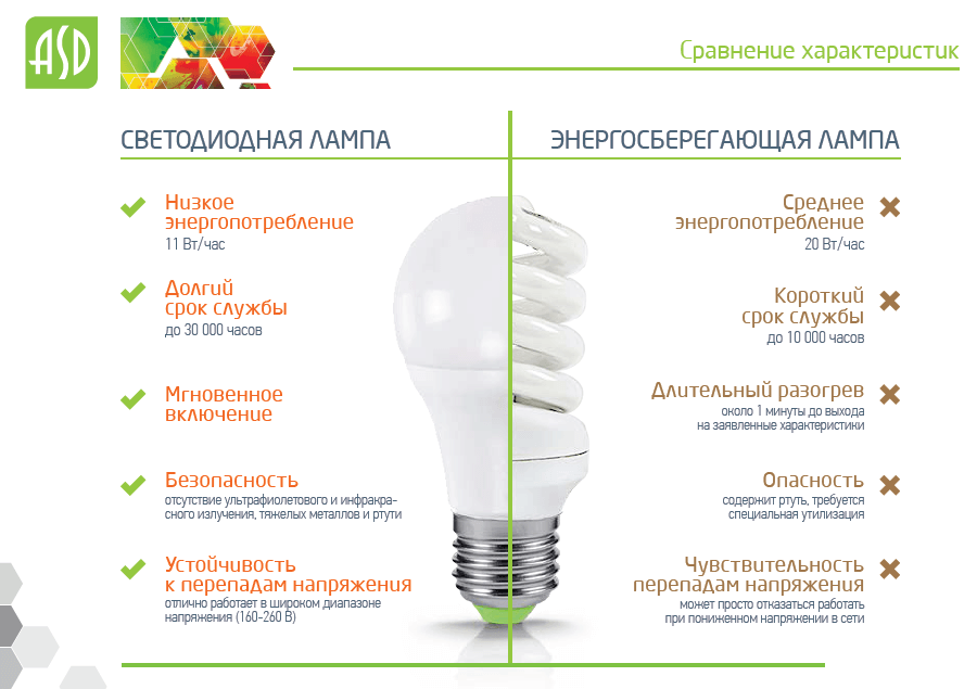 Если говорить о сроках службы, то средний у энергосберегающих он в среднем — 10 000 часов. У светодиодных этот показатель выше: в среднем — 30 000 часов, но есть заявки производителей на 50-60 тыс. часов работы.