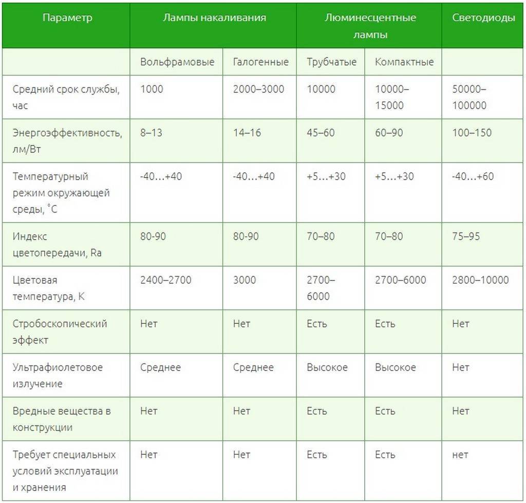 Таблица для сравнения светодиодных и энергосберегающих ламп