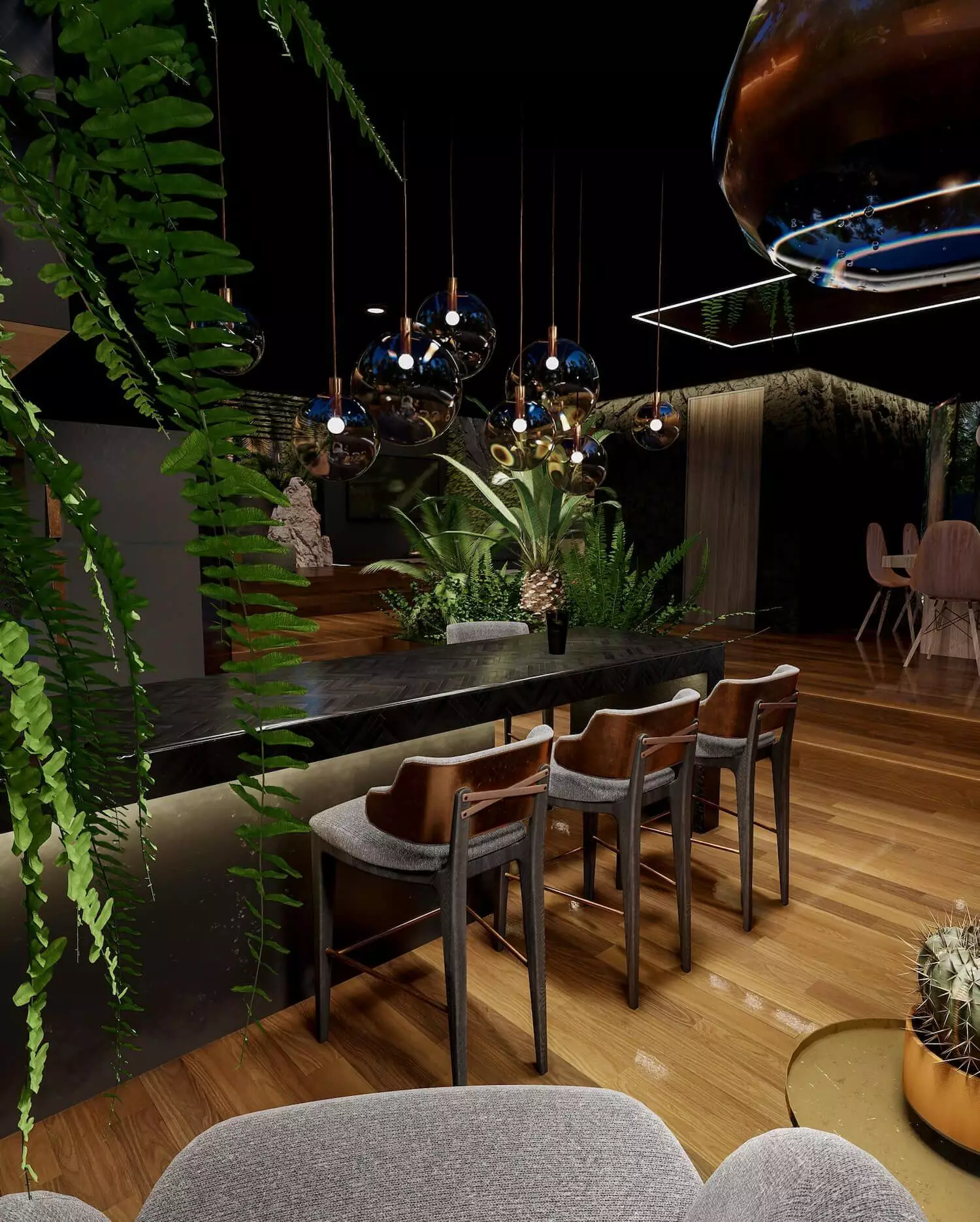 Что касается принтов, то в этом дизайне они отсутствуют, так как в них нет необходимости. Узор натурального дерева, каменная фактура, переплетение зеленых растений смотрятся органичнее, чем полоса, особая геометрическая форма или барочный принт.
