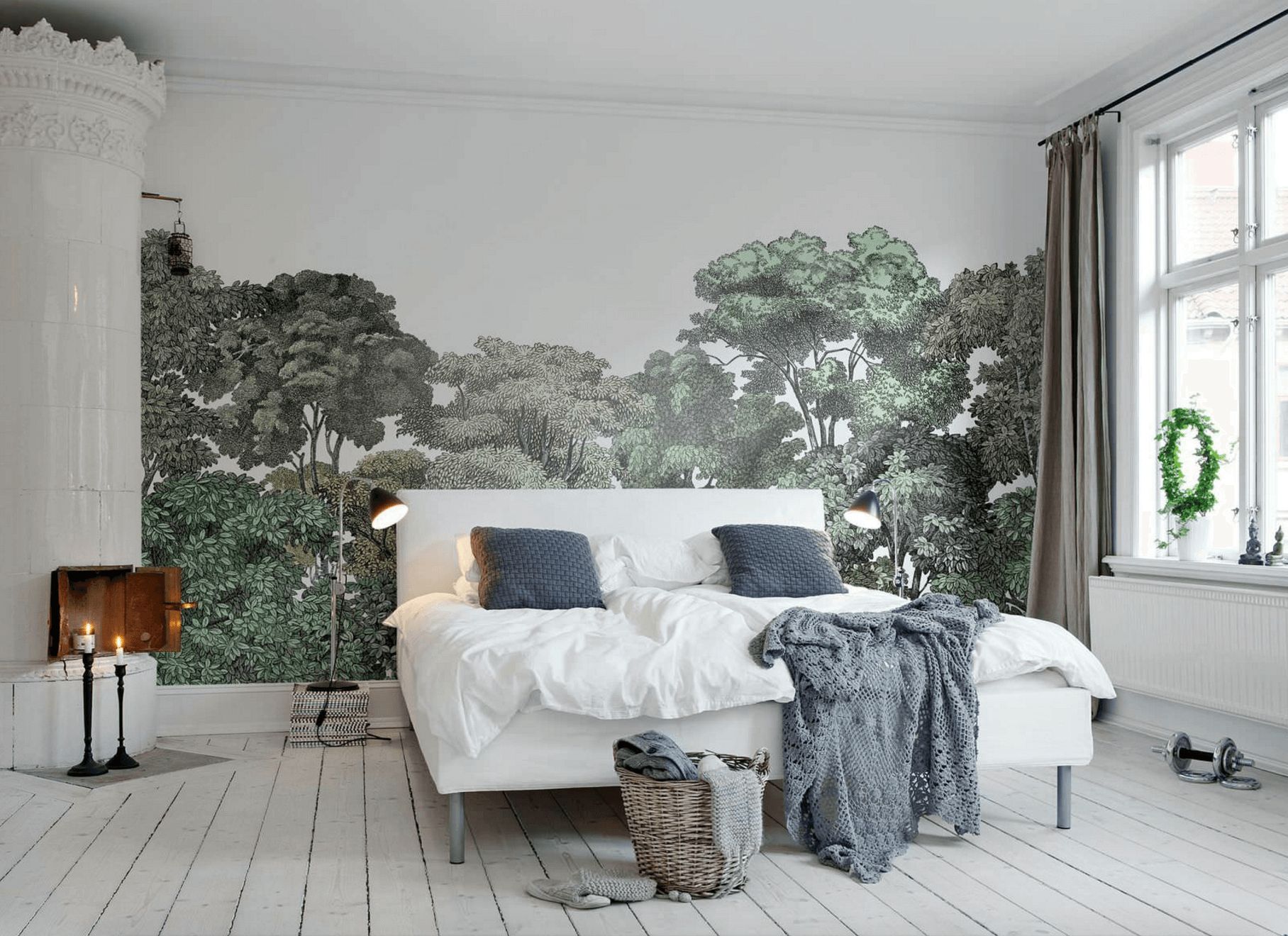 - Фотообои и фрески. Такое украшение стен изображениями реалистичных видов и пейзажей – самый простой и быстрый способ воплотить в жизнь идею слияния с природой. И в этом нет ничего фальшивого и противоестественного, если подходить к реализации этой идеи обдуманно и выбирать идеальный для обстановки в помещении – и, прямо скажем, дорогой вариант. Это не то чтобы доступно, но стоит своей цены: крупные бренды очень серьезно относятся и к процессу производства, и к качеству, и к безопасности материалов для фресок и фотообоев.