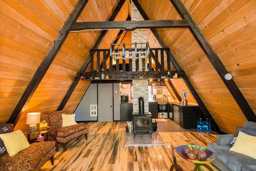 Оформление интерьера дачного дома треугольной формы часто выполняют без отделки, но с комфортомИсточник evrookna-mos.ru