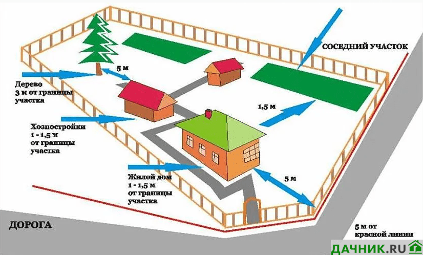 - если внутри подразумевается обустройство санузла, вся постройка должна находиться на расстоянии от 1 метра до ближайшей границы с соседним участком от 8 метров до основного жилого дома;