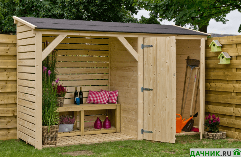 Садовый инструмент (грабли, лопаты, вилы и пр.). Для хранения этого инструмента достаточно постройки размером 1,5х1,5 м. В ней дополнительно можно установить крючки или специальную подставку для хранения секаторов, ножовок и пр.