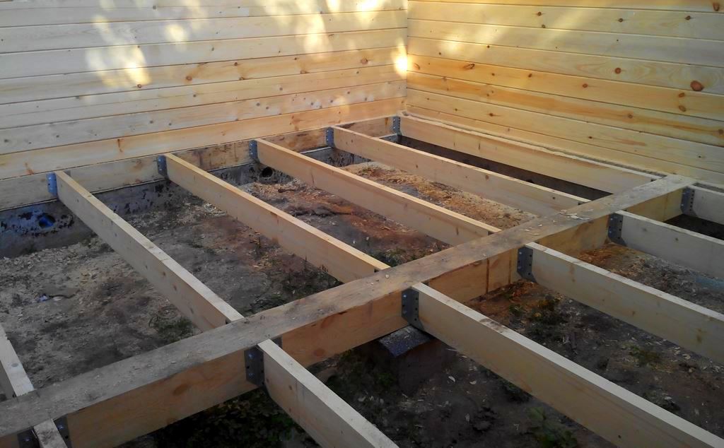 Протекающие полы очень просты в своём устройстве. Вам не составит особого труда их сделать. На фундамент, через рубероид или подобный гидроизоляционный материал, укладываем балки для пола. Устанавливаем их строго по горизонту, применяя верёвку, гидроуровень или лазерный нивелир. Лучшие сорта древесины – это хвойные породы. Оптимальным вариантом будет лиственница: она не боится влаги и плесени, хорошо пропитана смолой. Если её нет, можно применять сосну или ель.