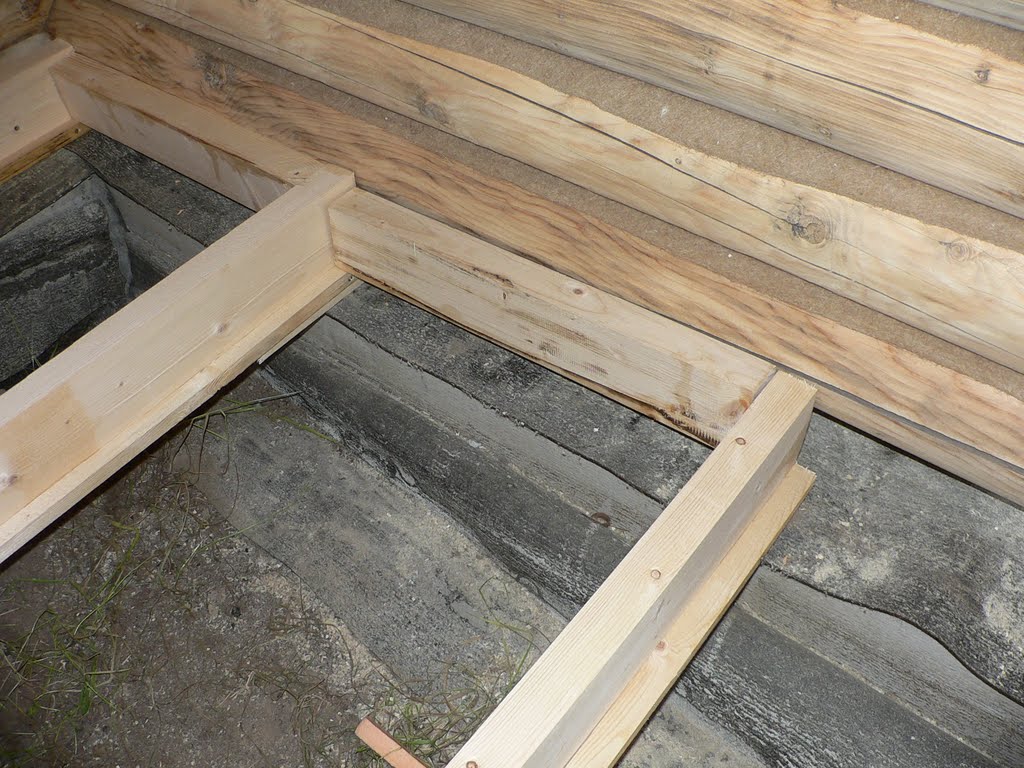 - После подъема производится капитальный ремонт основы пола. Заделываются при необходимости повреждения фундамента и стяжки. На закладном брусе с помощью ножовки удаляются гнилые зоны. Эти балки целесообразно заменить полностью. После замены поврежденных элементов производится антисептическая обработка и укладывается новый утеплитель.