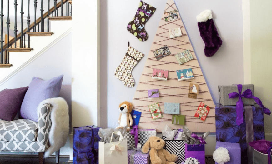 - поставьте маленькую елочку на возвышении или смастерите настенное новогоднее деревце из мишуры, хвойных веток, гирлянд, которое не займет место в тесной комнате;