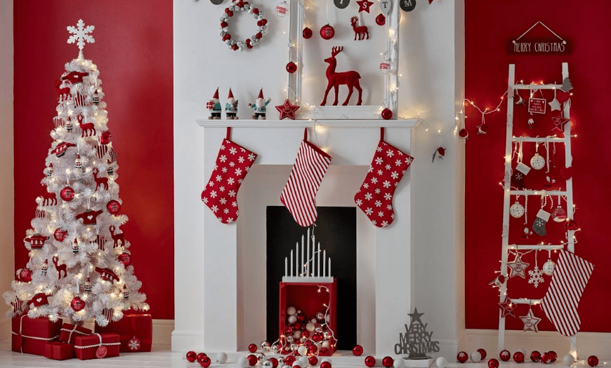 Мерцающие рождественские шары, гирлянды, сверкающая мишура и блестящие зимние украшения выглядят красиво с использованием традиционных и альтернативных рождественских елок и ярких окон, дверей, стен и потолков.