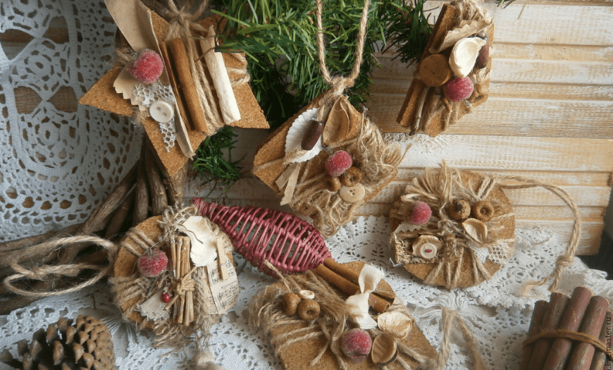 - Вырезают украшения из коры дерева, например, сердечки, зайчиков, елки, приклеивают к ним петли.
